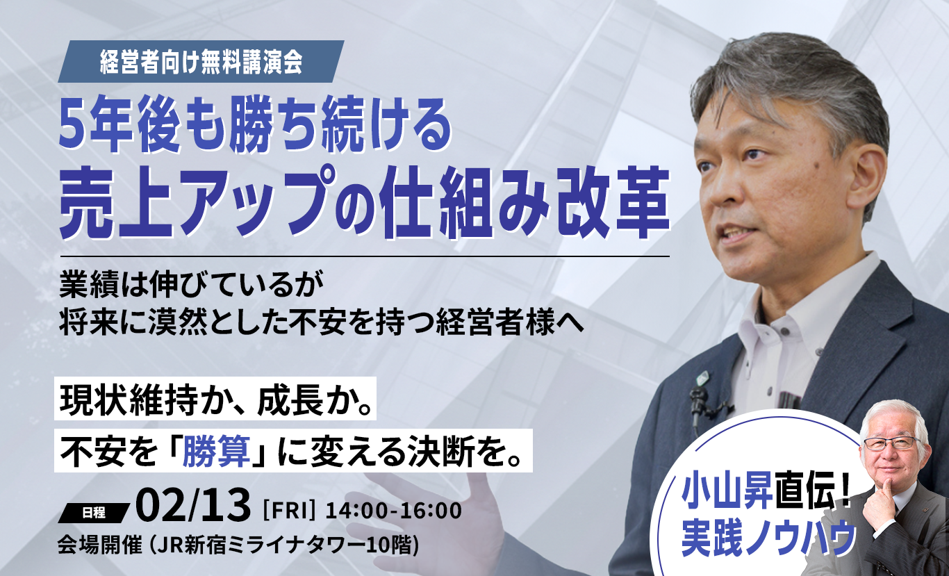 2/13㈮開催 経営者向け無料講演会 「5年後も勝ち続ける売上アップの仕組み改革」 2026/01/20 一般向け経営セミナー 2026年2月13日(金)14:00~16:00 JR新宿ミライナタワー10階 お申込み・詳細はこちら 一覧に戻る